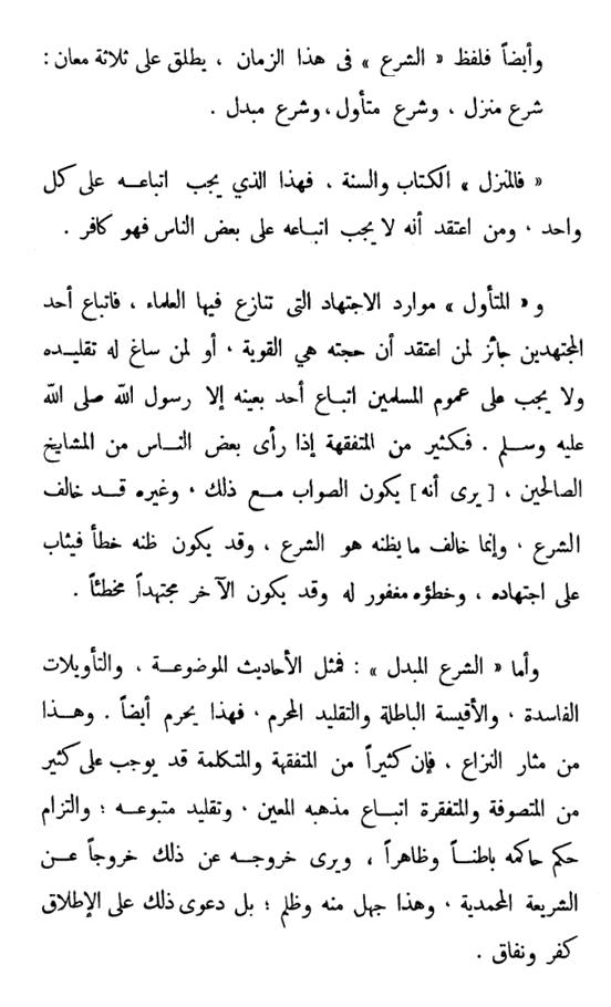 ۳۔ وہ ’’شریعت’’ جو باطل اور بے بنیاد ہے اور من گھڑت دلائل کی روشنی میں مختلف گروہوں نے اس کی پیروی اختیار کر رکھی ہے۔ امام صاحب اس ضمن میں بعض فقہی گروہوں اور متصوفین کا ذکر کرتے ہیں جو اپنے متعلقین پر خاص فقہی مذہب یا صوفیانہ مسلک کی پیروی کو لازم قرار دیتے اور اس سے خروج کو شریعت محمدیہ سے خروج کا درجہ دیتے ہیں۔
