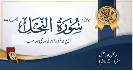 اس آیت میں چونکہ “تبيين ما نزل إليهم” کو نبی کی ذمہ داری قرار دیا گیا ہے، اس لئے غامدی صاحب نے بھی اپنے تصور بیان پر تفصیلی گفتگو کرتے ہوئے اس آیت کی ایسی توجیہ کی جو ان کے نظریہ بیان سے ہم آہنگ ہو۔ آیت کے حوالے سے ان کا موقف یہ ہے کہ یہاں “تبيين ما نزل إليهم” سے مراد قرآن کو “بلا کم وکاست” پہنچانا ہے نہ کہ اس کی شرح و وضاحت، یعنی یہاں بیان پہلے (اظہار الشیئ کے) معنی میں آیا ہے۔ اس اعتبار سے آیت کا مفہوم یہ بنا کہ “(اے نبی جی) ہم نے یہ یاد دہانی آپ کی طرف اِس لیے اتاری ہے کہ آپ اسے بے کم و کاست ان لوگوں تک پہنچا دیں تاکہ اُس کی روشنی میں اُن حقائق کو سمجھ سکیں جن کو سمجھانا خدا کے پیش نظر ہے”۔ اس موقف کی تائید میں ان کا کہنا ہے کہ ہماری تفسیری روایت نے بھی اس آیت کے دو معنی لیے ہیں اور ان کے طے کردہ دوگانہ معانی اس علمی روایت کی صدائے بازگشت ہے۔ اس مقصد کے لیے انہوں نے بعض مفسرین (علامہ طبری (م 310 ھ)، علامہ زمخشری (م 535 ھ)، امام رازی (م 606 ھ) اور علامہ ابن کثیر (م 774 ھ)) کو نمونے کے طور پر پیش کیا ہے تاہم ان کا اصل تکیہ تیونس کے مشہور مالکی عالم علامہ ابن عاشور (م 1393 ھ / 1973 ء) پر ہے جنہوں نے ان کے مطابق وضوح کے ساتھ اس آیت کے تحت ان دو معانی کو لکھا جس کے یہ قائل ہیں۔ چنانچہ علامہ ابن عاشور کی تفسیر “التحرير والتنوير” میں مذکور اس آیت کی دو توجیہات کو غامدی صاحب نے اپنے وضع کردہ بیان کے دوگانہ معنی سے مربوط قرار دیا اور اس سے قائم ہونے والے تاثر کو بنیاد بنا کر انہوں نے قدیم مفسرین کے ہاں بھی بیان کے اپنے وضع کردہ دو معنی کو پڑھنا شروع کردیا۔